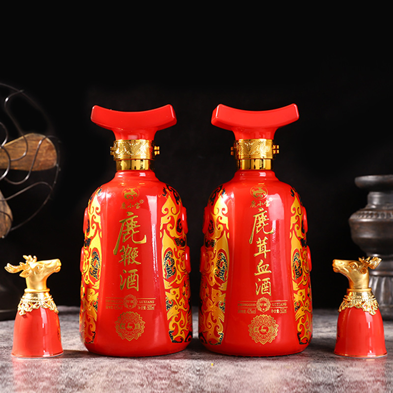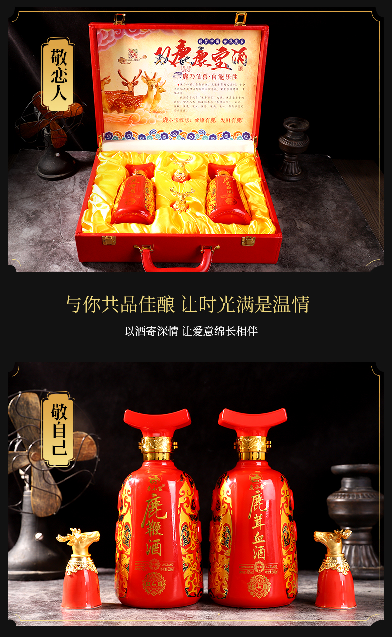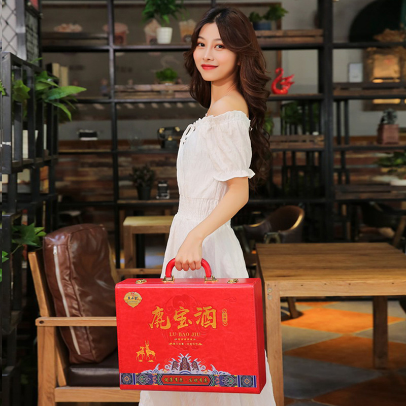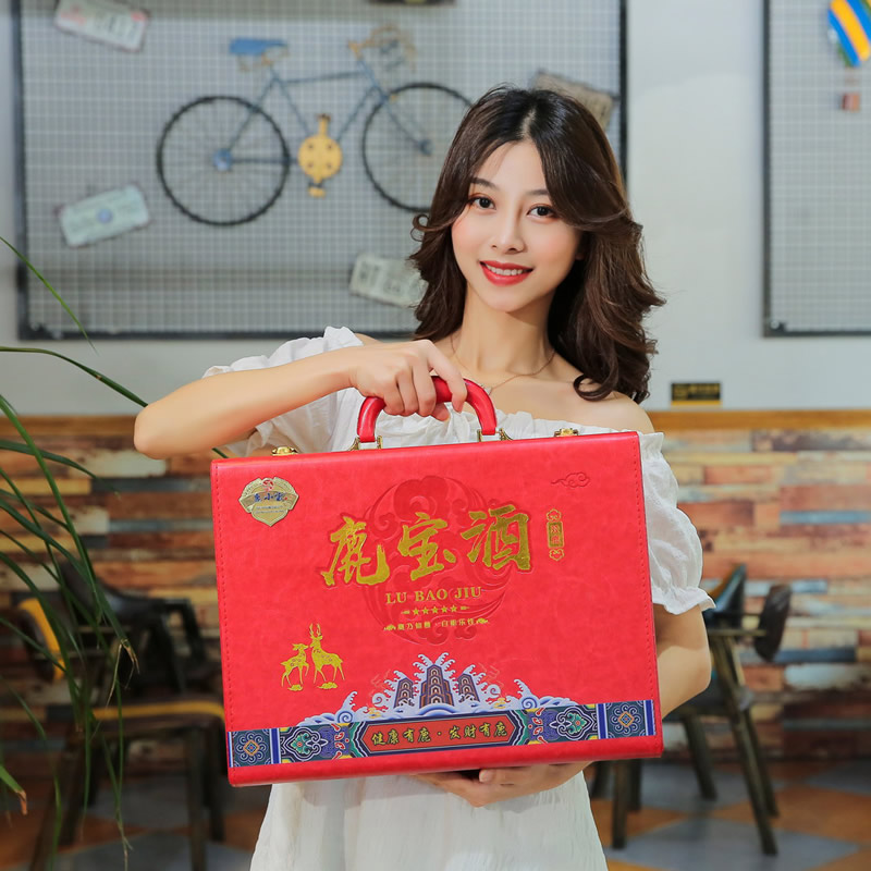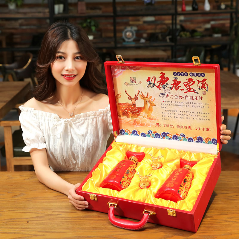 此产品为双瓶鹿宝酒,由鹿鞭酒x1,鹿茸血酒x1,包装选用中国红皮质材质,配置一对鹿头酒杯,整体视觉更加精美.