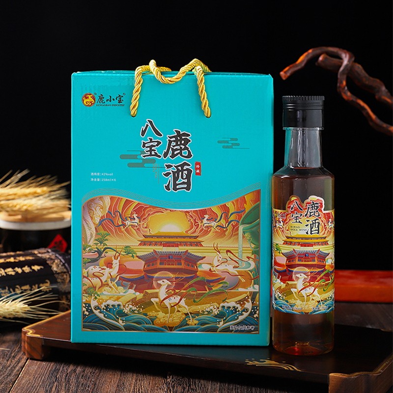 此产品由258ml鹿鞭酒x6,包装选用纸板材质,产品即为电商爆款,也适合自用,整体设计精美大气,设计精美.