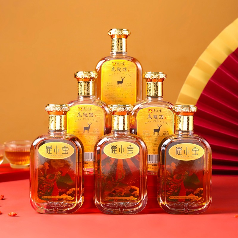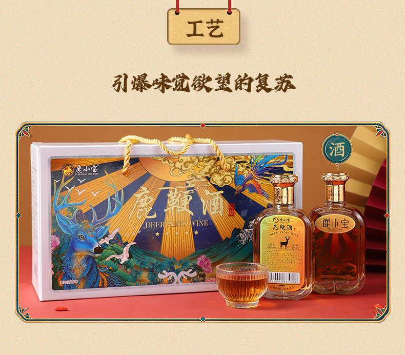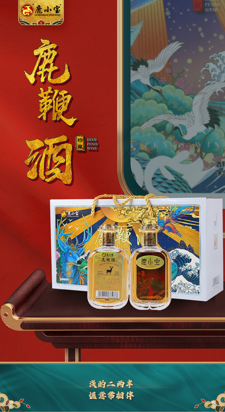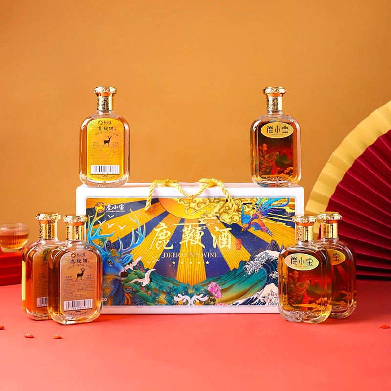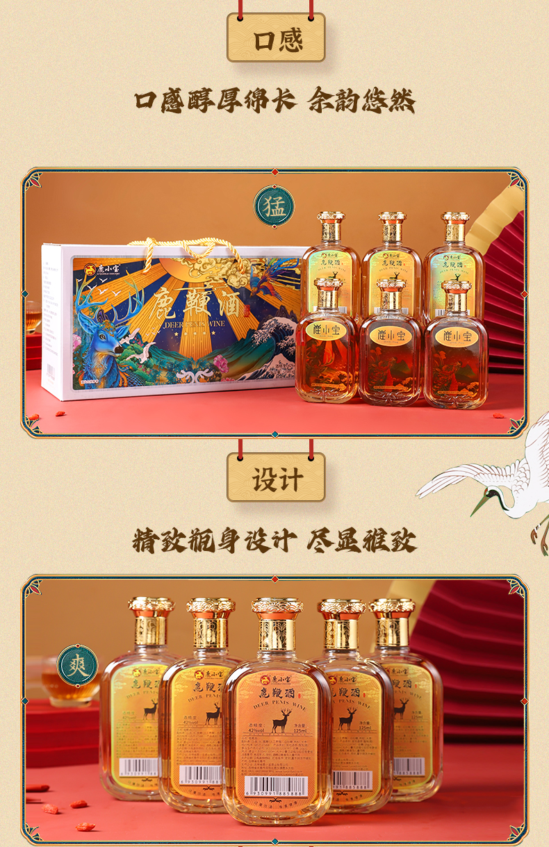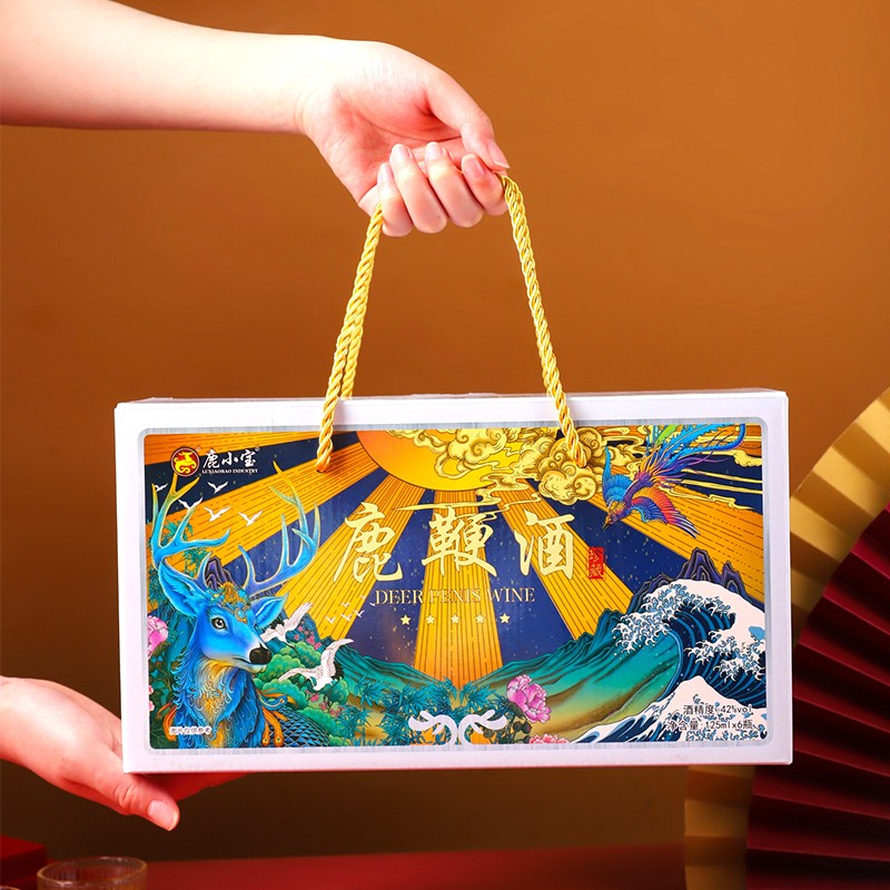 此产品由125ml鹿鞭酒x6瓶,另选用精美特色瓶身,新型背透瓶标设计,包装选用国风插画风格,显得更加精美大气.