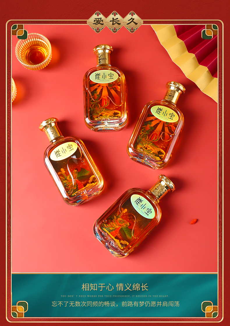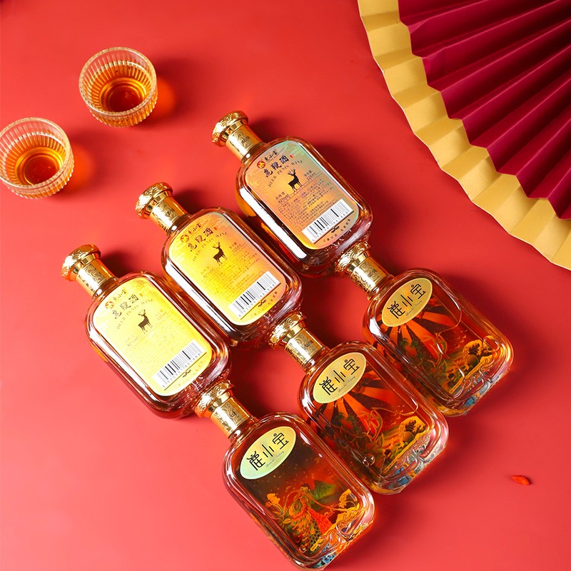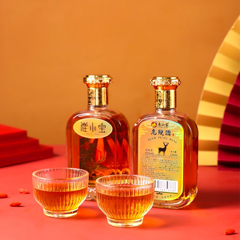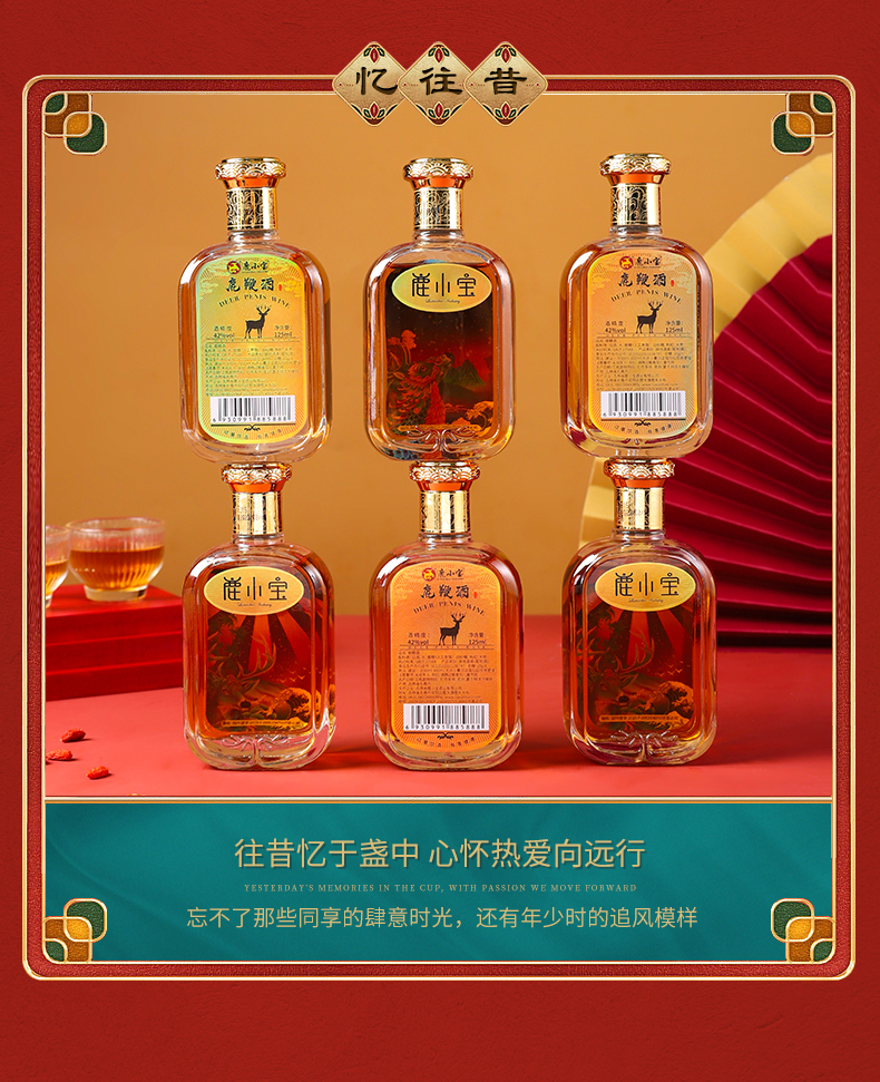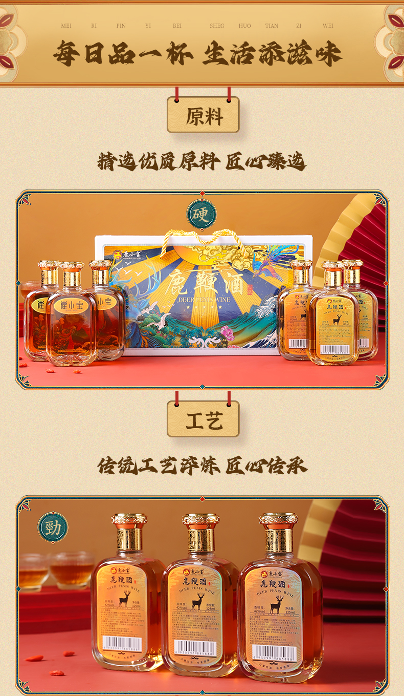 此产品由125ml鹿鞭酒x6瓶,另选用精美特色瓶身,新型背透瓶标设计,包装选用国风插画风格,显得更加精美大气.