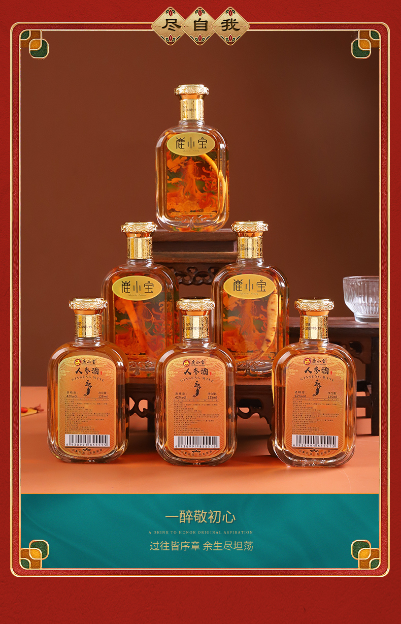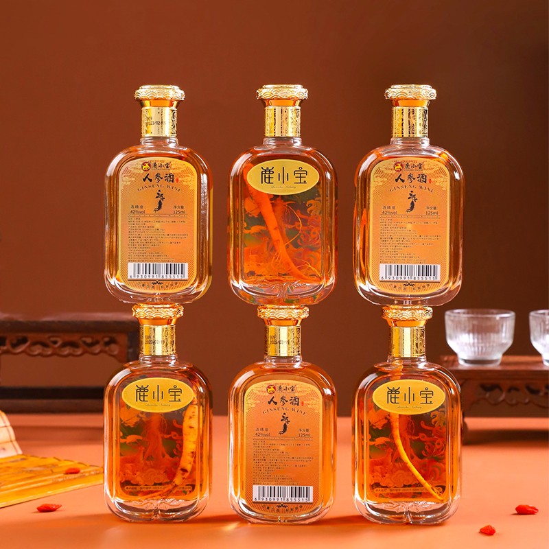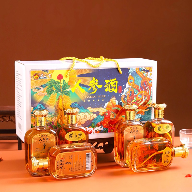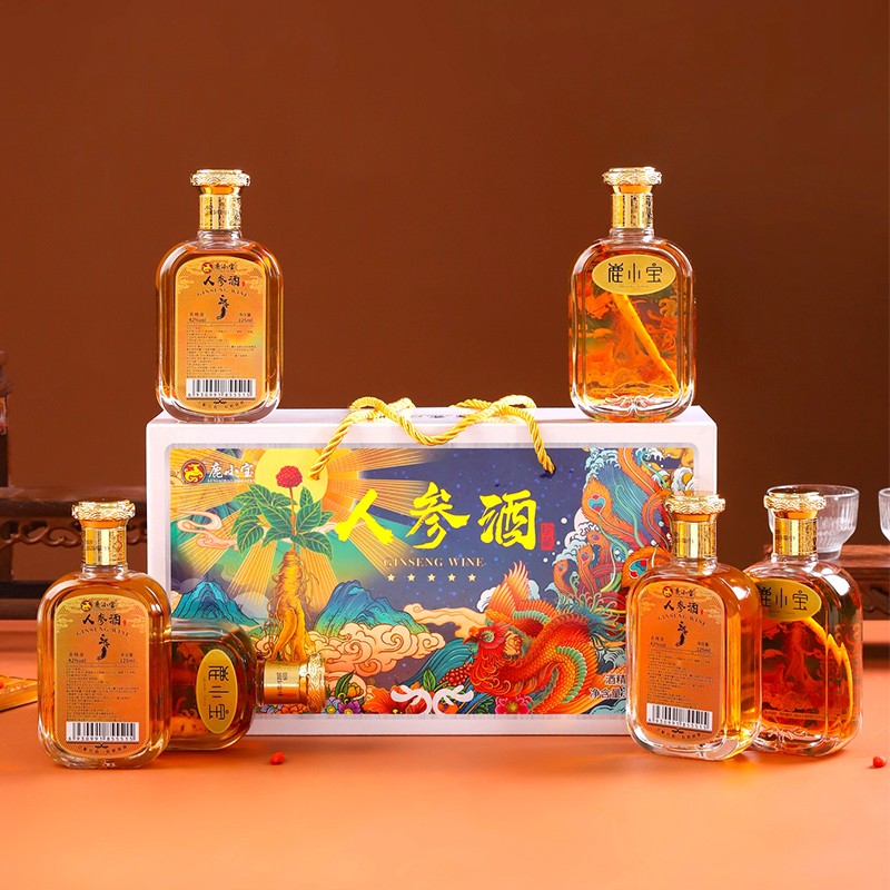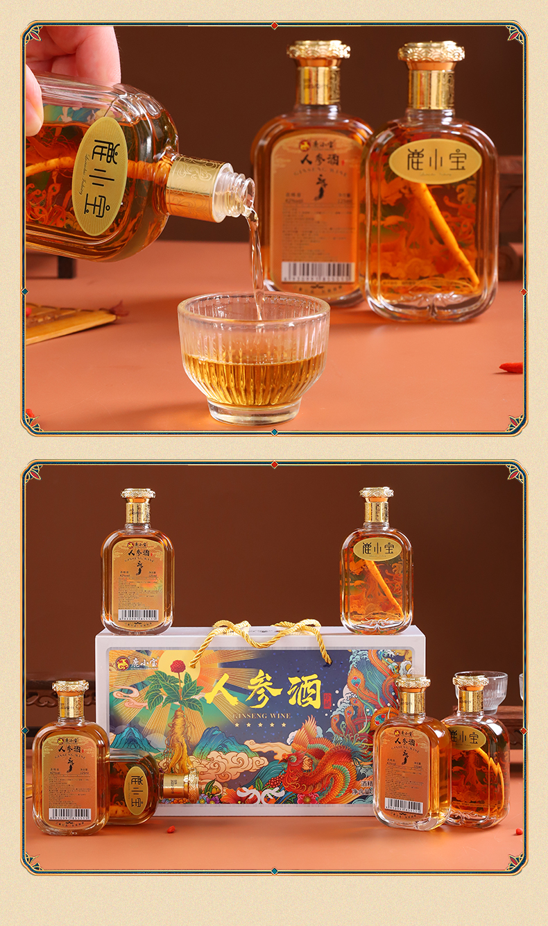 此产品由125ml人参酒x6瓶,另选用精美特色瓶身,新型背透瓶标设计,包装选用国风插画风格,每瓶带有一颗人参,显得更加精美大气.