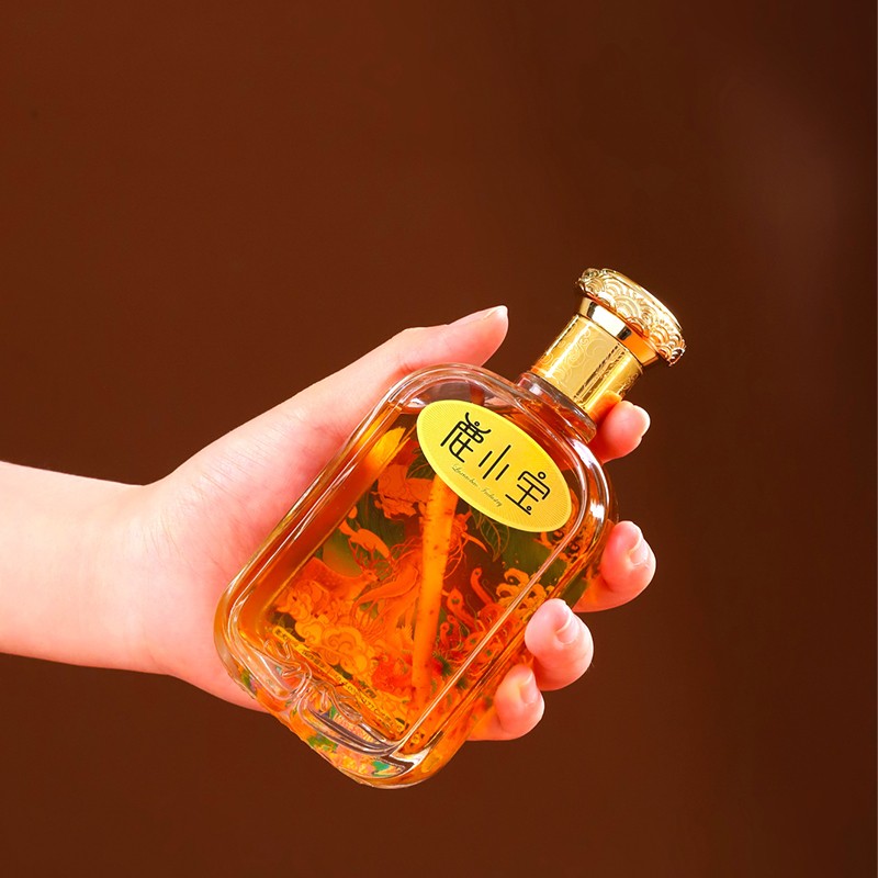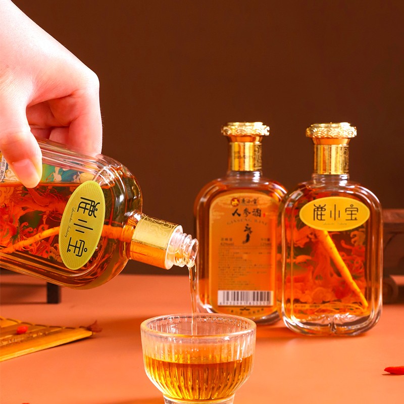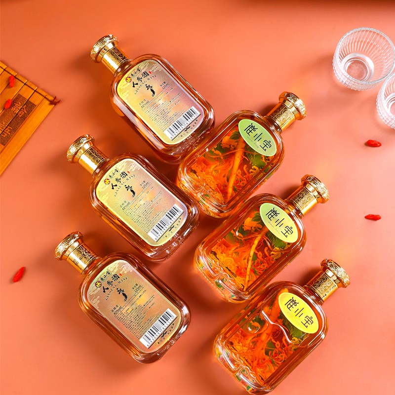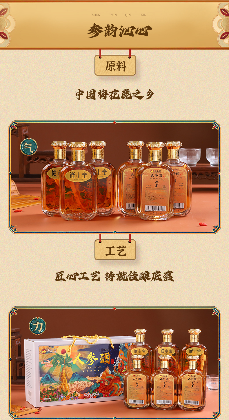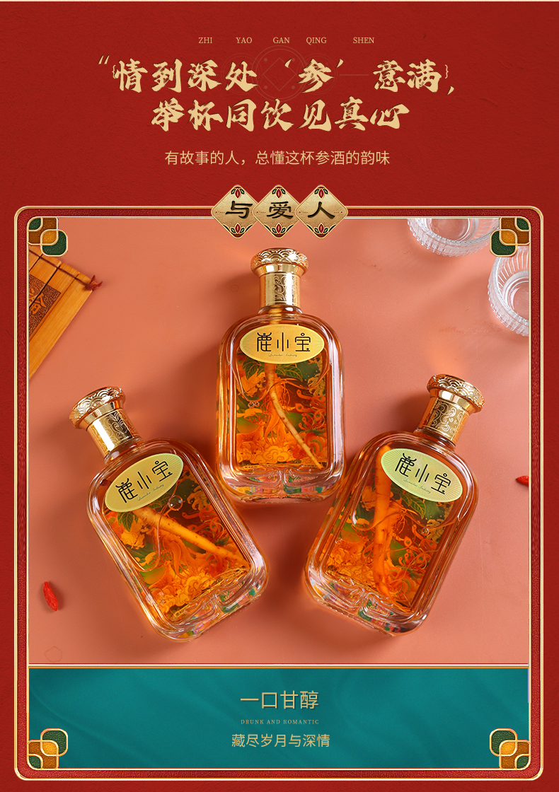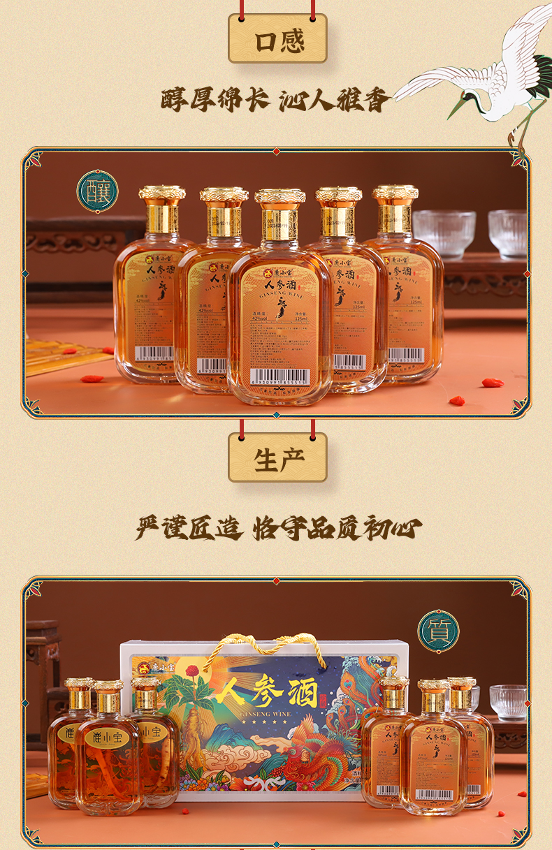 此产品由125ml人参酒x6瓶,另选用精美特色瓶身,新型背透瓶标设计,包装选用国风插画风格,每瓶带有一颗人参,显得更加精美大气.