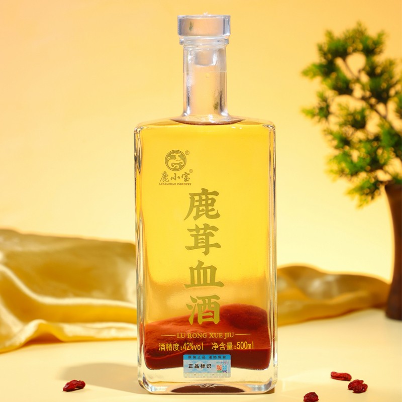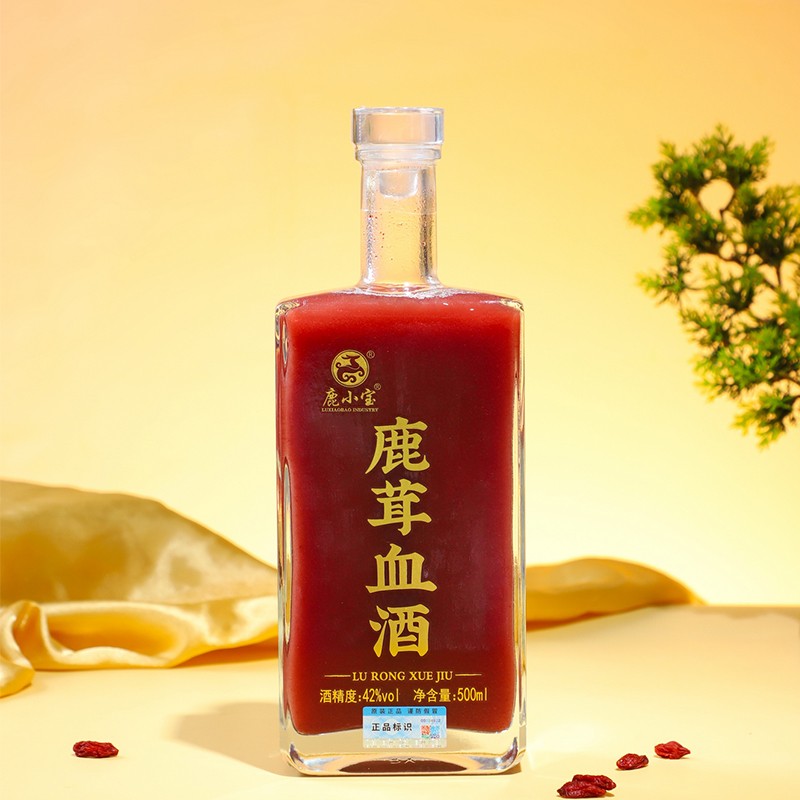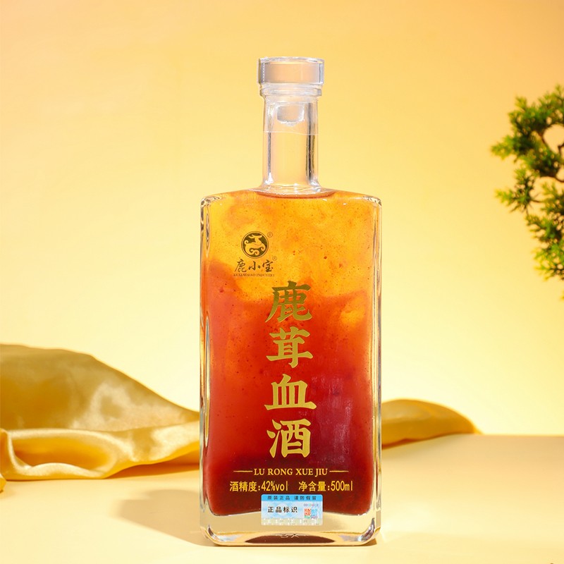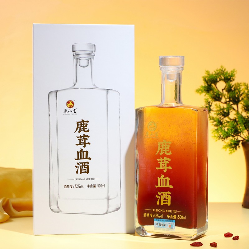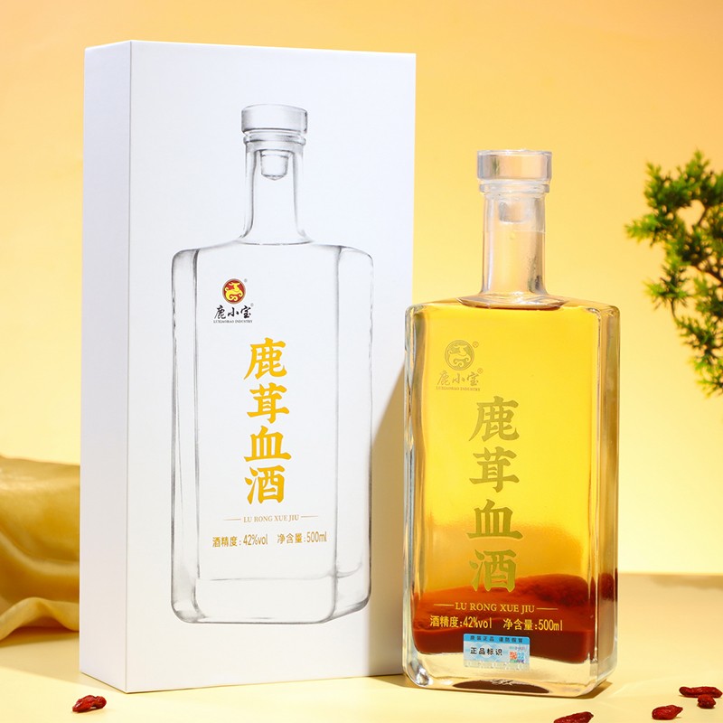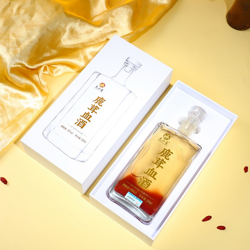 此产品由鹿茸血酒x1,包装盒选用工业版材质,烫金工艺,设计简洁大气,整体显得精美大气.